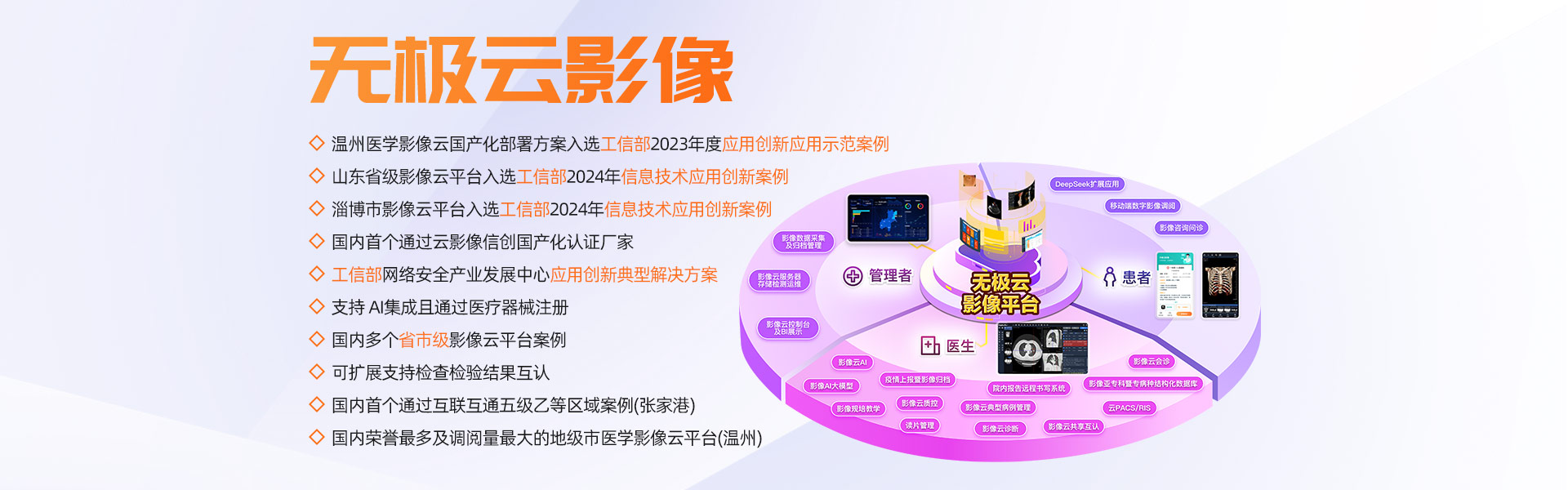 影像信息化深耕15年以上,影像產(chǎn)品群全面,擁有全院PACS/RIS、影像檢查醫(yī)技臨床預(yù)約、云影像(云膠片)、區(qū)域影像暨檢查互認(rèn)、影像中臺(tái)、影像人工智能、MDT多學(xué)科聯(lián)合會(huì)診、遠(yuǎn)程醫(yī)療協(xié)同平臺(tái)解決方案,是國(guó)內(nèi)極少能全面提供上述全套產(chǎn)品群的廠家之一。